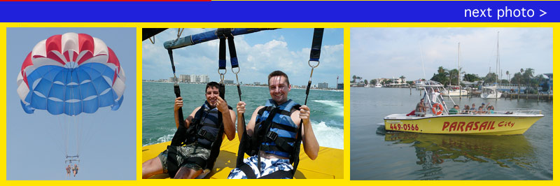 Wear Sunscreen – that sun is HOT! If you are looking for parasailing in the florida sun, choose Clearwater Beach, Florida to parasail. Parasail City was the parasail company we picked due to their outstanding service and their ability to make my parasail trip extremely fun and exciting. We headed out in the parasail boat, out into the gulf of mexico. Clearwater Beach is located 45 min. from Tampa and 30 min. from St .Petersburg, FL. We have been parasailing in the clearwater area for over 20 years. It is our Florida parasailing experience that has made us one of the most respected parasail companies in Florida. Join us for you next vacation in Clearwater Beach, and make sure you schedule your parasailing trip in advance as to make sure of weather delays. Our Parasailing vessel is the most state-of-the-art parasail boat you can buy. It is one of the newest parasailing boats you can find in all of Florida. Many tourist that return from a parasail trip say they see Clearwater in a whole new light. On a clear day on Clearwater Beach it seems possible to see all the way to Tampa. Parasailing is so relaxing it can place you in what we call a "parasail state of mind" meaning all cares have melted away and all you see is the life going on beneath your feet. Our Parasailing crew is the best in Florida. They are dedicated to your parasailing experience and will help you with any questions you may have about the clearwater beach area and the history of parasailing in general. Come and Fly with the best! Parasail City located on Clearwater beach, FL.